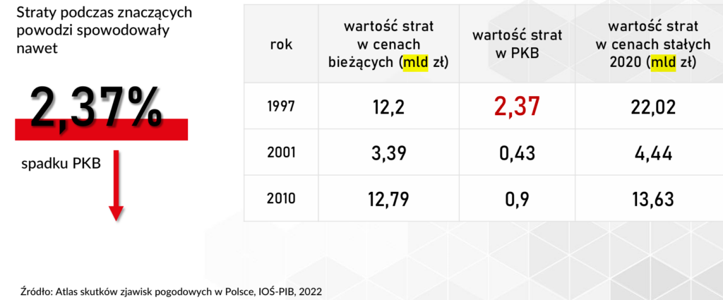 Najgorsze lata przyniosły o wiele większe straty. „Powódź tysiąclecia” z 1997 r. pochłonęła ponad 22 mld zł (w przeliczeniu na wartość z 2020 r.), czyli prawie 2,4% PKB Polski. Powódź z 2010 r. przyniosła zaś straty na poziomie 13,6 mld zł, a powódź z 2001 r. – na poziomie blisko 4,5 mld zł.