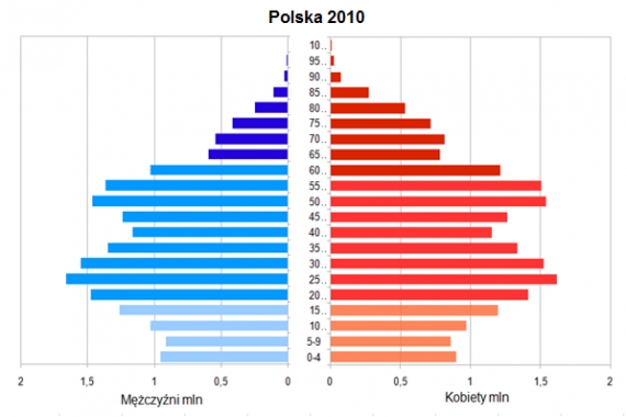 Ilustracja 4.5. Piramida wiekowa – Polska 2010. Kolor ciemny to emeryci, kolor pośredni to osoby w wieku produkcyjnym, a kolor jasny to dzieci i młodzież. Źródło: World Population Prospects, ONZ.