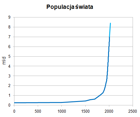 Ilustracja 5.1. Populacja świata. Linia niebieska – dane rzeczywiste, linia jasnoniebieska – prognoza ONZ. Źródło: World Population Prospects, ONZ, Wikipedia.