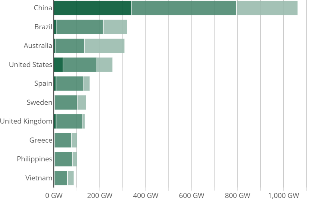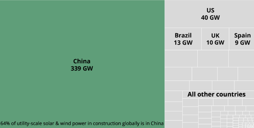 Chiny są też zdecydowanym liderem pod względem wszystkich planowanych mocy wiatrowych i słonecznych. Planowanych, a więc tych znajdujących się w fazie przygotowań oraz zapowiedzianych. To kolejne ponad 720 gigawatów w wielkoskalowych elektrowniach słonecznych i wiatrowych, które zostanie zainstalowane jeszcze w tej dekadzie.