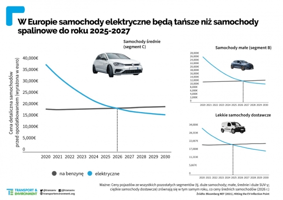 Według Bloomberg New Energy Finance za kilka lat samochody elektryczne i dostawcze w każdym segmencie w Europie będą tańsze w produkcji niż pojazdy napędzane paliwami kopalnymi. W przypadku sedanów oraz SUV-ów ma tak się stać w 2026 r., a w przypadku osobówek – w roku 2027. Co więcej, zdaniem BNEF za sprawą spadających kosztów baterii i linii produkcyjnych dedykowanych dla pojazdów elektrycznych zakup takich pojazdów będzie przeciętnie tańszy nawet bez dotacji.