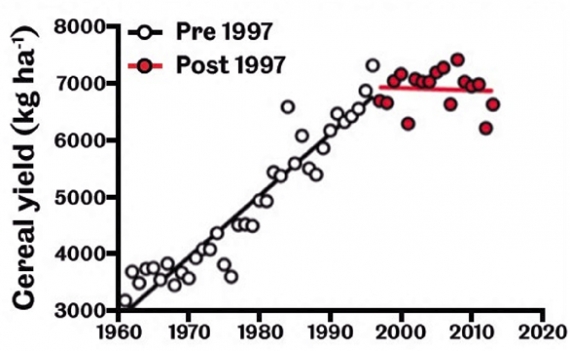 Rysunek 2. Stagnacja plonów zbóż w Wielkiej Brytanii. Dane Banku Światowego.