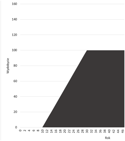 Z początku dostępna jest tylko pierwsza technologia. W naszym modelu ruszamy z inwestycjami, co roku dla prostoty inwestując tyle samo pieniędzy. Po 10 latach zaczyna płynąć pierwsza ropa. Co roku, w miarę uruchamiania kolejnych projektów wydobywamy coraz więcej ropy. Po 30 latach stare projekty są zamykane, co jest dokładnie kompensowane przez wydobycie z nowo uruchamianych projektów i dostawy ropy stabilizują się. Opisana sytuacja jest pokazana na rysunku 2.