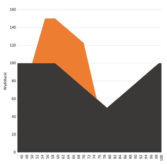 Przyjmijmy, że wraz z opracowaniem technologii 2 połowa na inwestycje wydobywcze tego typu zostaje skierowana połowa środków, a druga połowa wciąż będzie inwestowana w projekty typu 1. Jak zmieni się wydobycie?
