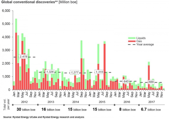 Kilka miesięcy temu Rystad Energy podsumowała w swoim raporcie, że nowe odkrycia konwencjonalnych złóż ropy i gazu wyniosły w 2017 roku łącznie niecałe 7 mld baryłek, co odpowiada zaledwie 11% wydobycia.