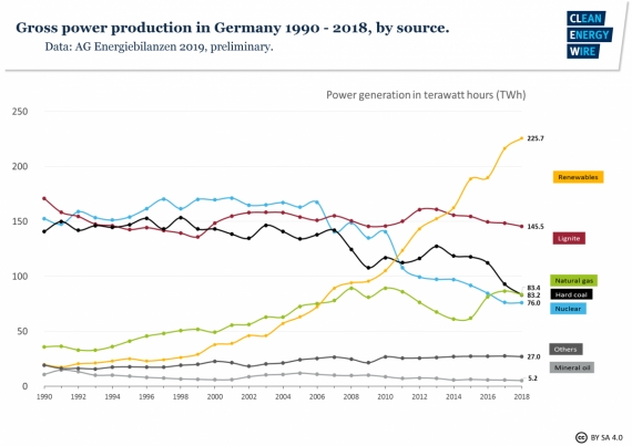 Na to poseł Kukiz’15 zarzucił: „To jak pan wytłumaczy fakt, że Niemcy zwiększają ilość spalanego węgla”? Tu odpowiedź powinna być prosta: To nie jest fakt, ale ściema – ilość spalanego przez Niemcy węgla wcale nie rośnie, ale szybko spada. Niemcy nie zużywają węgla do ogrzewania domów czy w transporcie, prawie całość (poza znacznie mniejszym zużyciem na potrzeby przemysłowe, np. w hutnictwie) jest zużywana w elektrowniach. Przyjrzyjmy się, z jakich źródeł energii Niemcy wytwarzają prąd: