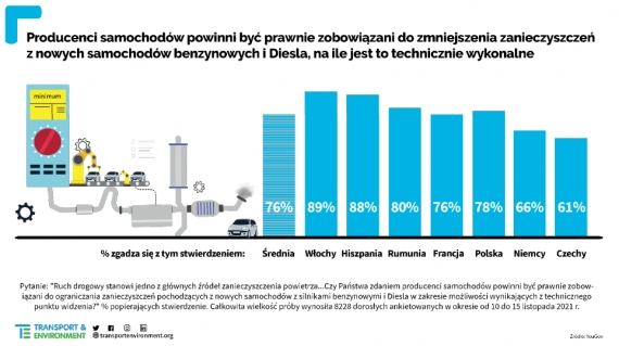 Z badania YouGov wynika, że opinia publiczna popiera zmiany i w tym zakresie. Ponad trzy czwarte (76%) ankietowanych w Polsce twierdzi, że samochody powinny spełniać minimalne dopuszczalne normy emisji zanieczyszczeń bez względu na to jak, kiedy i gdzie jeżdżą. Średnie poparcie wśród mieszkańców z wszystkich państw biorących udział w badaniu jest równie wysokie – wynosi 77%.