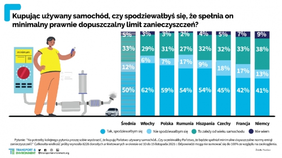 Dlatego w badaniu spytano też respondentów o to, czy kupując używany samochód spodziewaliby się, że spełnia on minimalny, prawnie dopuszczalny limit zanieczyszczeń. Ponad połowa (59%) ankietowanych w Polsce oświadczyła, że tak, a tylko 7%, że nie. Średnia dla wszystkich państw to odpowiednio 50% i 12%.