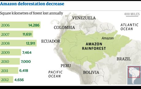 Z satelitarnych danych Brazylijskiego Narodowego Instytutu Badań Kosmicznych wynika, że tempo wylesiania lasów deszczowych Amazonii znacznie spadło. Pomiędzy sierpniem 2011 a lipcem 2012 roku. wycięto 4656 km2 lasu deszczowego. To o 27% mniej niż rok wcześniej (6418 km2). To najniższy poziom wylesiania od czasu rozpoczęcia pomiarów w roku 1988, podało brazylijskie ministerstwo środowiska pod koniec listopada zeszłego roku. Do lipca 2012 roku wylesianie spadło o 76%. Oznacza to, że Brazylia jest blisko wypełnienia celu zmniejszenia deforestacji o 80% względem 1990 roku, a dzięki temu jest już na półmetku wypełnienia kopenhaskiego zobowiązania – ograniczenia emisji gazów cieplarnianych o 36% do roku 2020, względem 1990.
