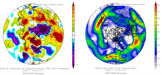 Rys. 3 Odchylenia temperatur od średniej 1981-2010 na półkuli północnej w okresie 8-11 maja 2017, oraz położenie prądu strumieniowego. W tym okresie odchylił się on w naszym regionie bardzo na południe, a nad Polskę napłynęły masy arktycznego powietrza. NOAA/ESRL