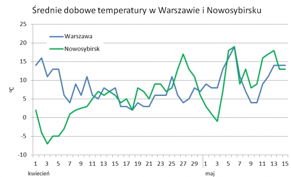 Rys. 4 Zmiany temperatur dobowych w okresie 1 kwietnia-15 maja 2017 w Warszawie i Nowosybirsku. Dane: Weather Undergroud i pogodaiklimat.ru