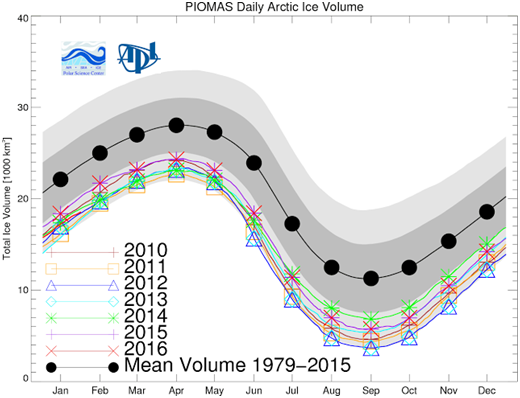 Rysunek 3: Objętość lodu w Arktyce w 2016 roku na tle ostatnich lat. PIOMAS
