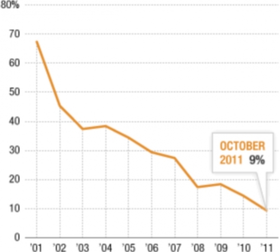 Rysunek 1. Procent obywateli amerykańskich zadowolonych z pracy kongresu w latach 2001 do 2011.