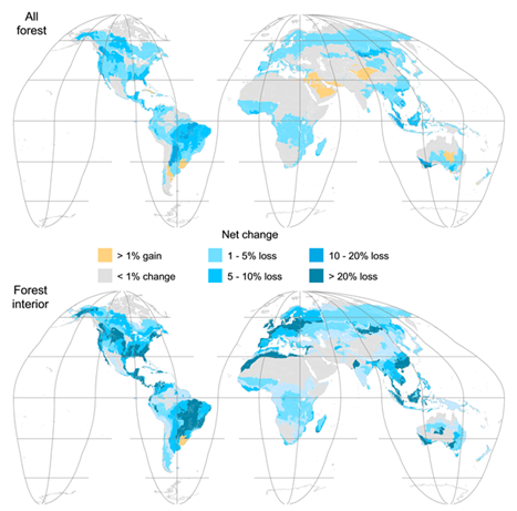 W latach 2000-2012 całkowitemu wylesieniu uległ obszar o powierzchni 1,71 mln km2, czyli 3,2% całości lasów. Jednak, jak pokazują badania przeprowadzone przez U.S. Forest Service, utrata najcenniejszych siedlisk, leżących wewnątrz lasów i odseparowanych od działalności ludzkiej (tzw. lasów wewnętrznych), postępuje 3-krotnie szybciej, niż wskazywałyby na to liczby dotyczące całkowitego tempa wylesiania. Ten trend zagraża funkcjom ekosystemowym, jaką pełnią na świecie lasy, w tym zapewnieniu odpowiedniego środowiska życia dla wielu zwierząt.