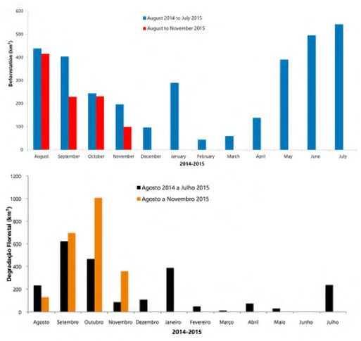 Przykładem regionu, w którym fragmentacja postępuje bardzo szybko jest brazylijska Amazonia. Chociaż absolutne tempo wylesienia spadło w listopadzie 2015 w porównaniu do listopada 2014 o blisko połowę, to tempo degradacji w tym czasie wzrosło aż o 323%/! Wylesianie skupiło się głównie w stanach Mato Grosso (32%), Para (24%), Rondonia (19%) i Amazonas (19%).