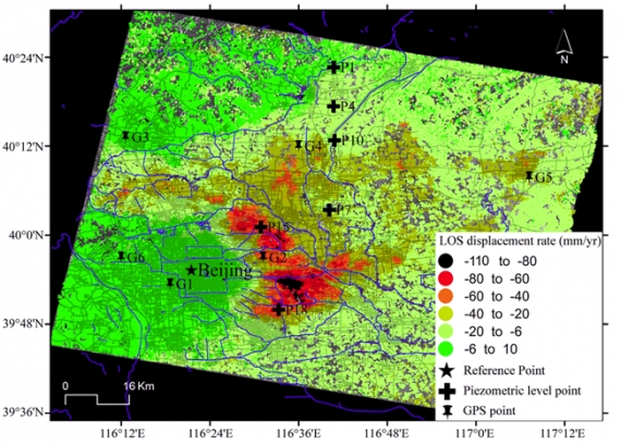 Rysunek 1. Dane satelitarne pokazujące osiadanie terenu w pobliżu Pekinu. Źródło Remote Sensing.