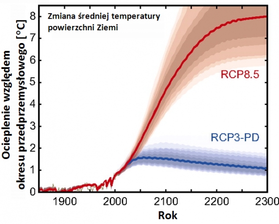 Rysunek 1: Wzrost średniej temperatury powierzchni Ziemi dwóch scenariuszach – spalenia wszystkich paliw kopalnych (RCP 8.5) oraz ograniczenia wzrostu temperatury do 2°C (RSP3-PD). Meinshausen 2011.