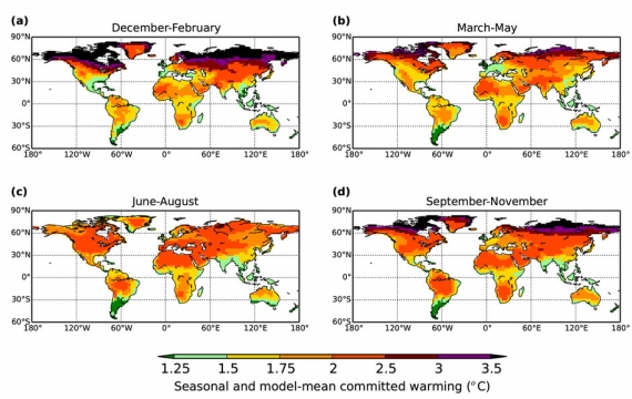 Rysunek 1. Prognozowany wzrost temperatury przy obecnych stężeniach gazów cieplarnianych dla różnych pór roku po osiągnięciu równowagi bilansu radiacyjnego (choć bez działania powolnych sprzężeń zwrotnych). (Huntingford i Mercado, 2016)