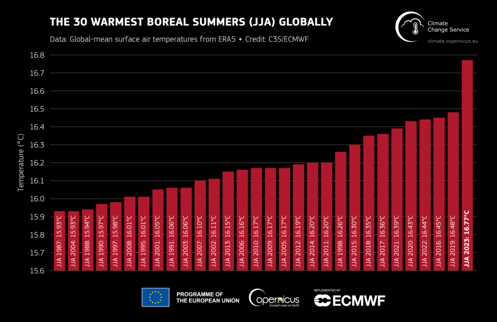 Jak wskazuje europejska agencja Copernicus, temperatury w okresie czerwiec-sierpień wyniosły średnio 16,77°C. Były więc o 0,66°C wyższe od średniej z lat 1991-2020 i o ok. 0,3°C wyższe od rekordowego do tej pory okresu z 2016 r.