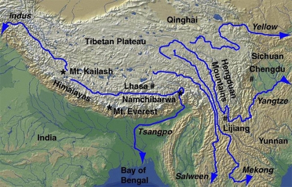 Rys. Rzeki wypływające z Płaskowyżu Tybetańskiego.